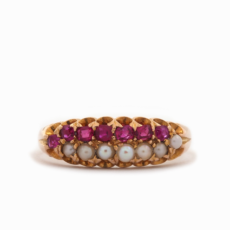 טבעת עתיקה זהב 15k עם רובינים ופנינים. חתומה. 2200 ש"ח.
