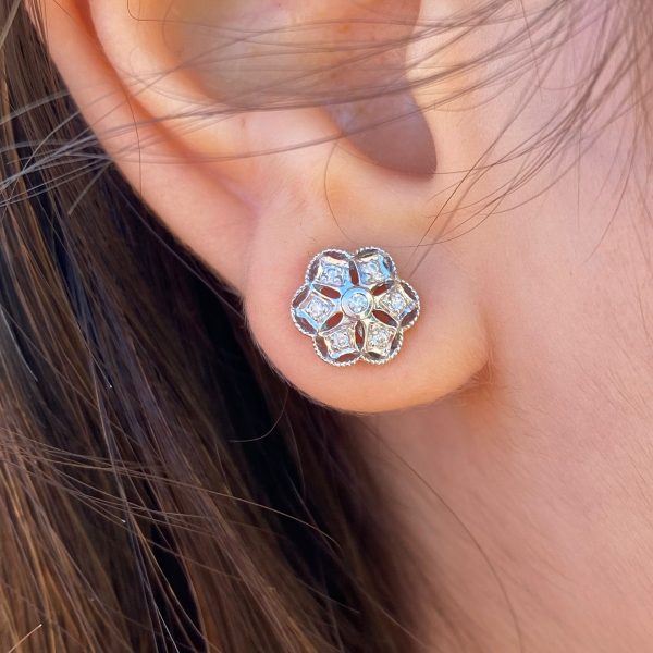 Classic antique stud cluster earrings, 14k gold with small diamonds