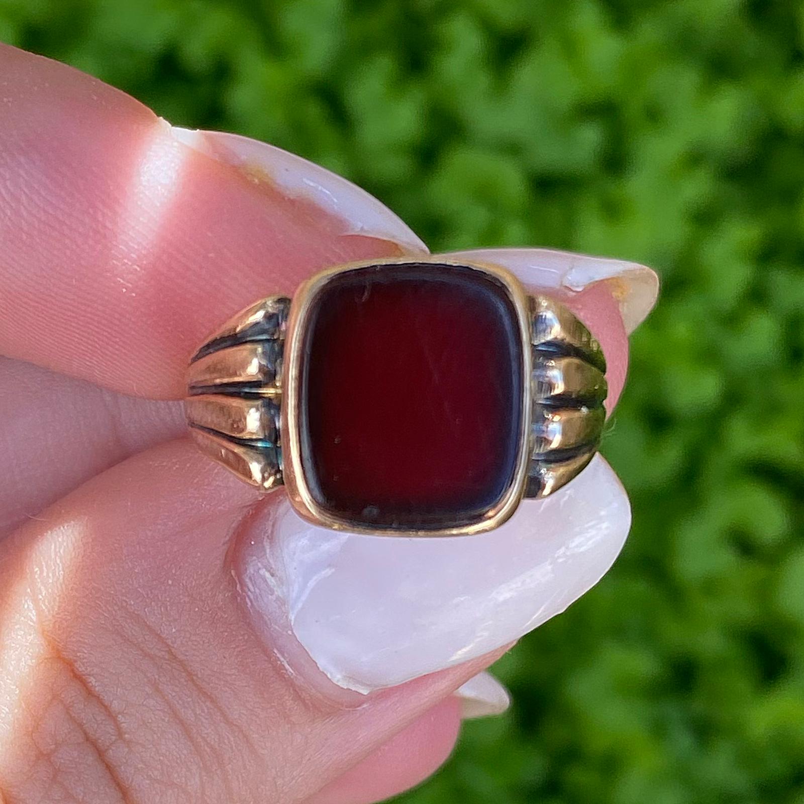 Antique Victorian signet ring (1899), 9k rose gold, with a carnelian and a beautiful split shank.