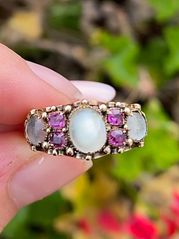 A beautiful Victorian ring, hallmarked, 18k gold, with rubies and cabochon-set moonstones .