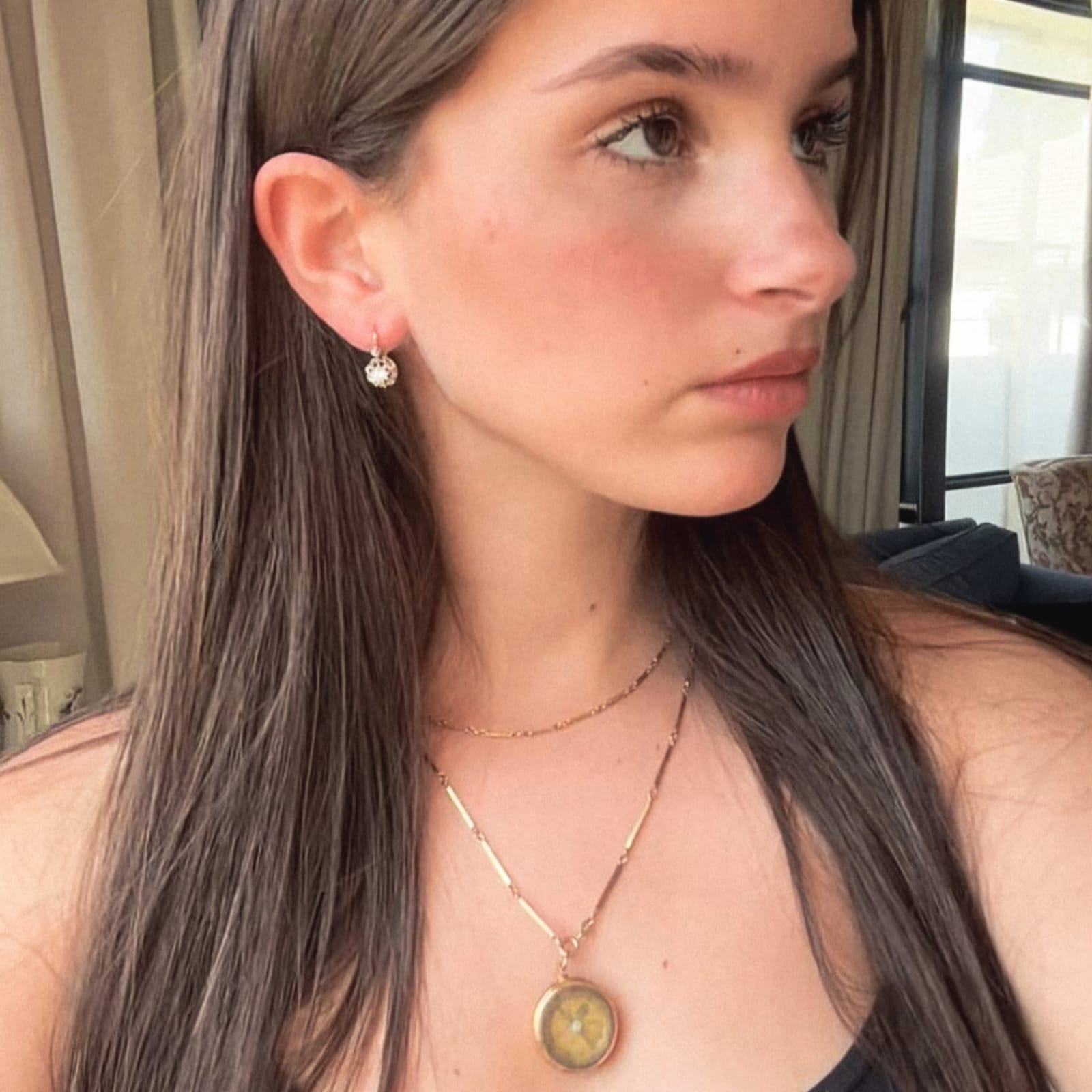 עגילים עתיקים תלויים אלגנטיים עשויים זהב 18 קאראט צהבהב ולבן, משובצים יהלומים טבעיים בליטוש עתיק.