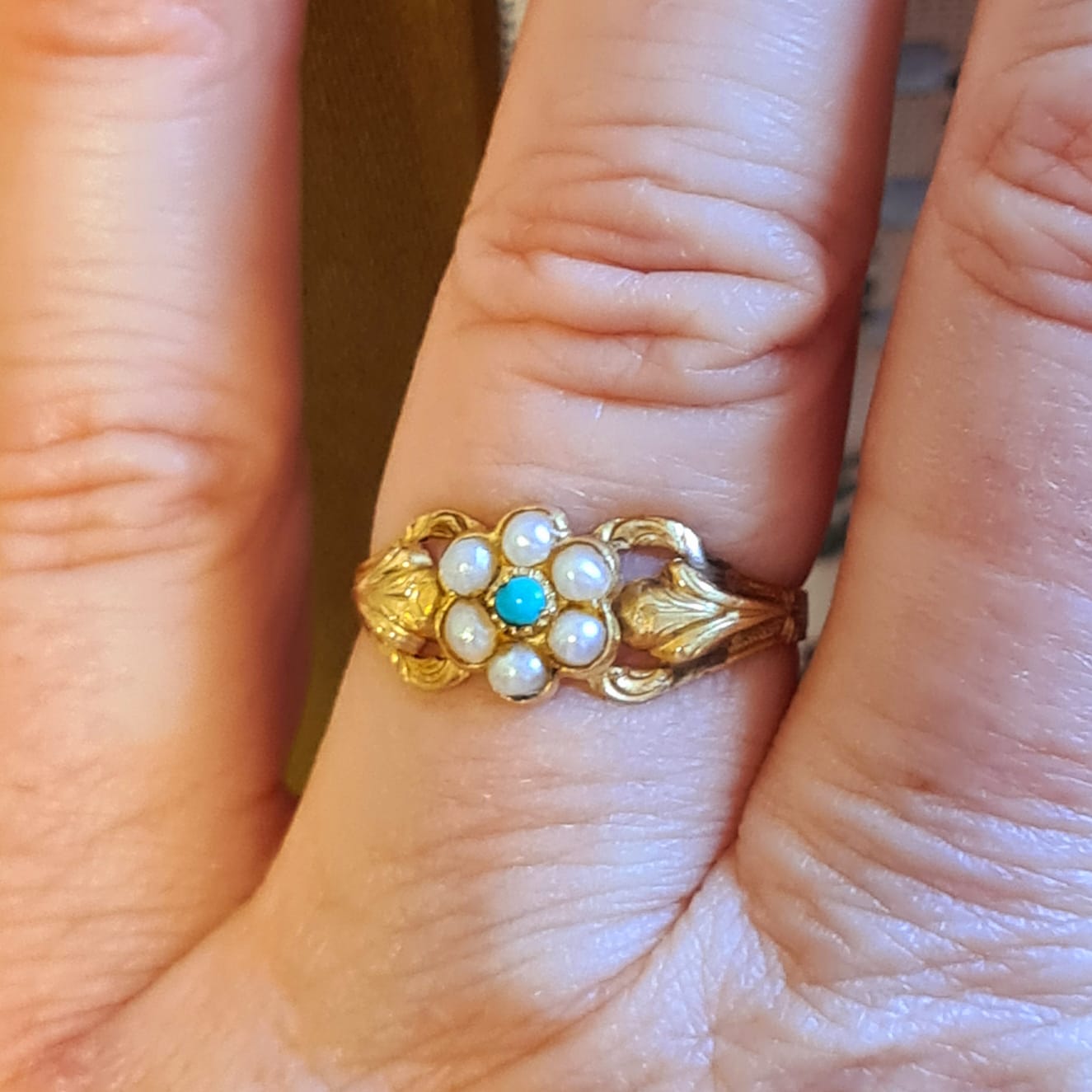 טבעת קלסטר ויקטוריאנית עתיקה, זהב 15k , עם אשכול של טורקיז ופנינים וחישוק מעוטר עם פליר דה ליס,