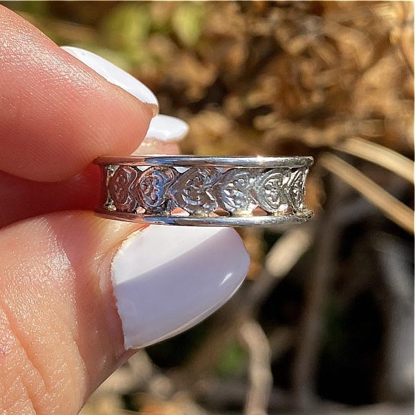 טבעת עתיקה, מפלטינה, חתומה, עם לבבות מעוטרים לכל רוחבה. טבעת אהבה יפהיפיה. מעולה לבד או לענידה כ stack