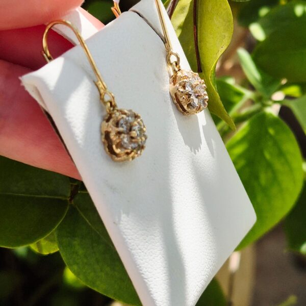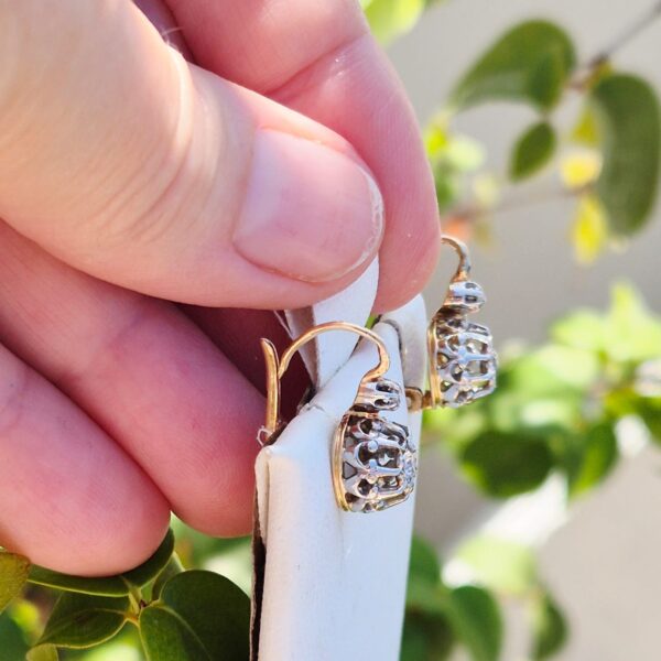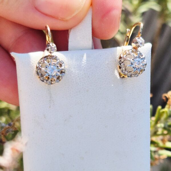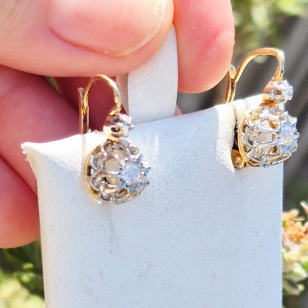 עגילים עתיקים תלויים אלגנטיים עשויים זהב 18 קאראט צהבהב ולבן, משובצים יהלומים טבעיים בליטוש עתיק.