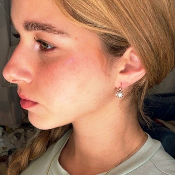 העגילים מעוצבים בסגנון קלאסי של סוף התקופה הוויקטוריאנית–תחילת האדוארדיאנית, עם בית אבן פתוח ומעודן המאפשר חדירת אור מרבית ליהלום.