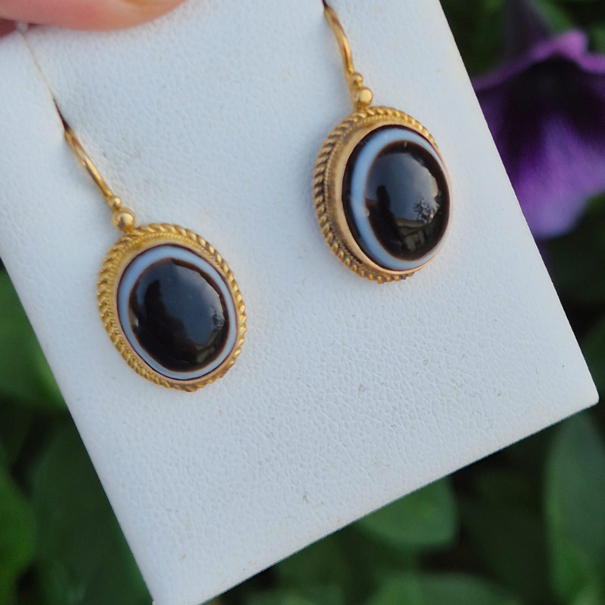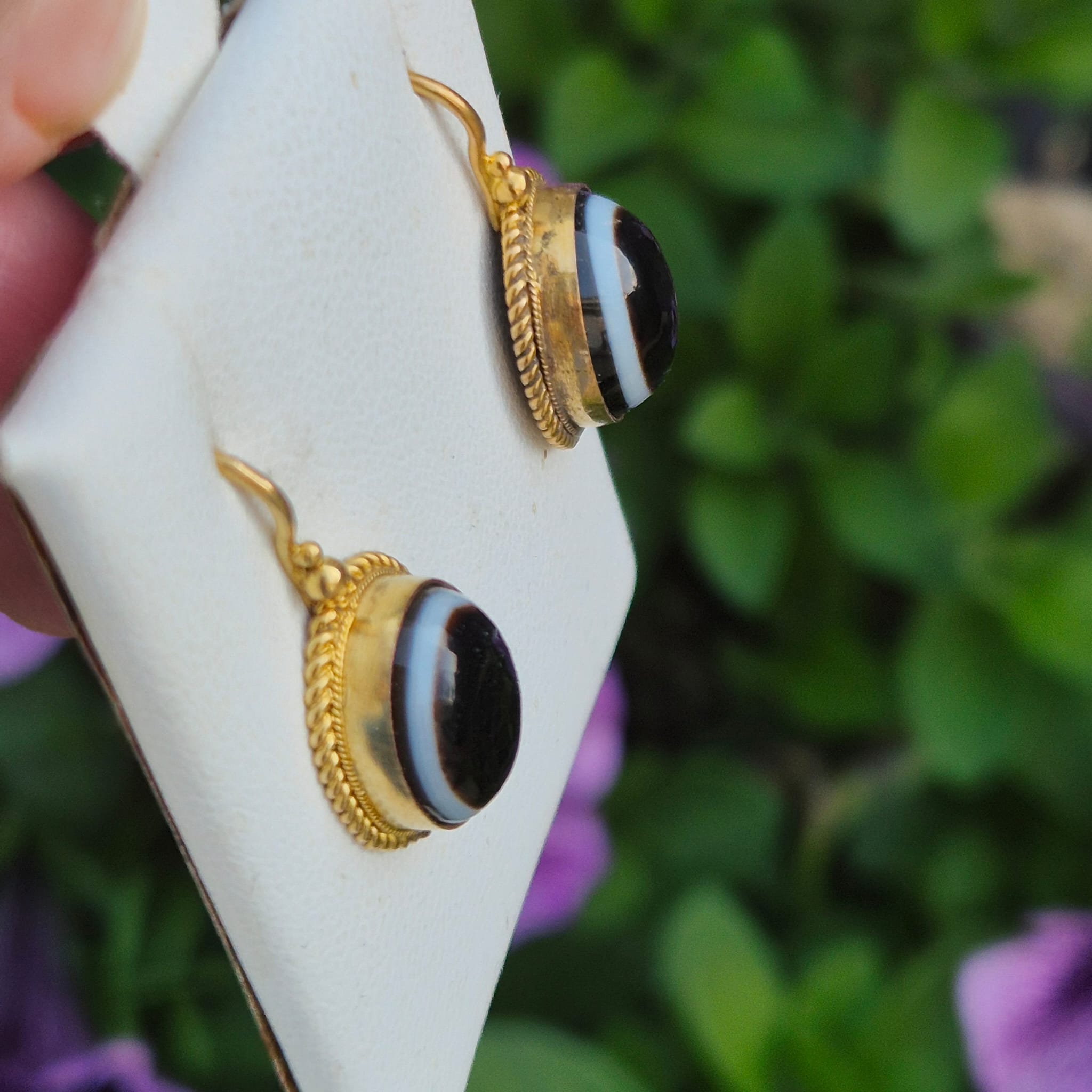 העגילים משובצים אבני אגט מסוג banded agate, מלוטשות כקבושון אובלי, בעלות ניגוד דרמטי בין שחור עמוק לחום וללבן.