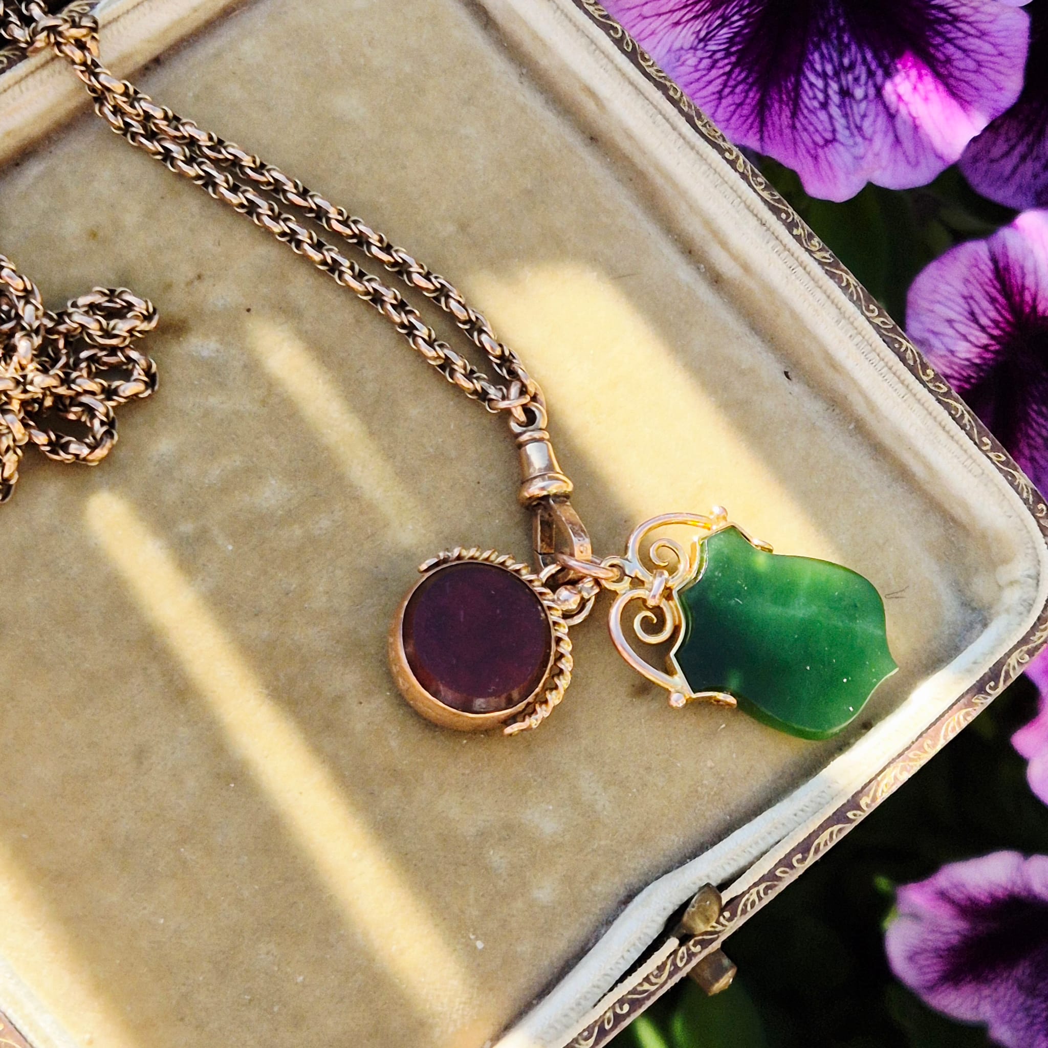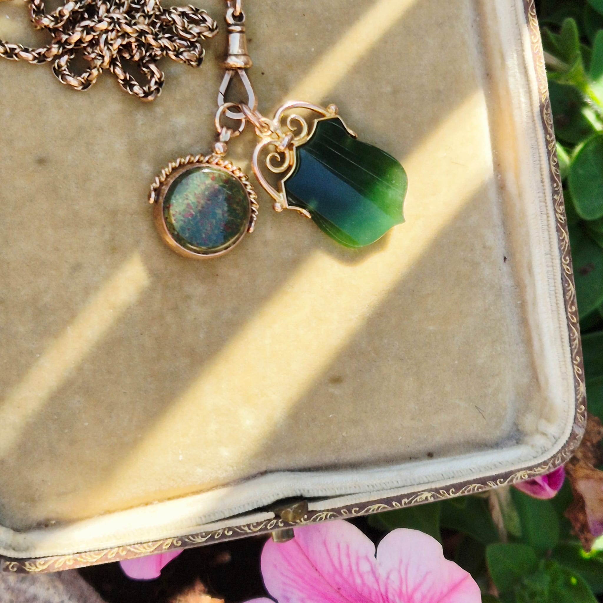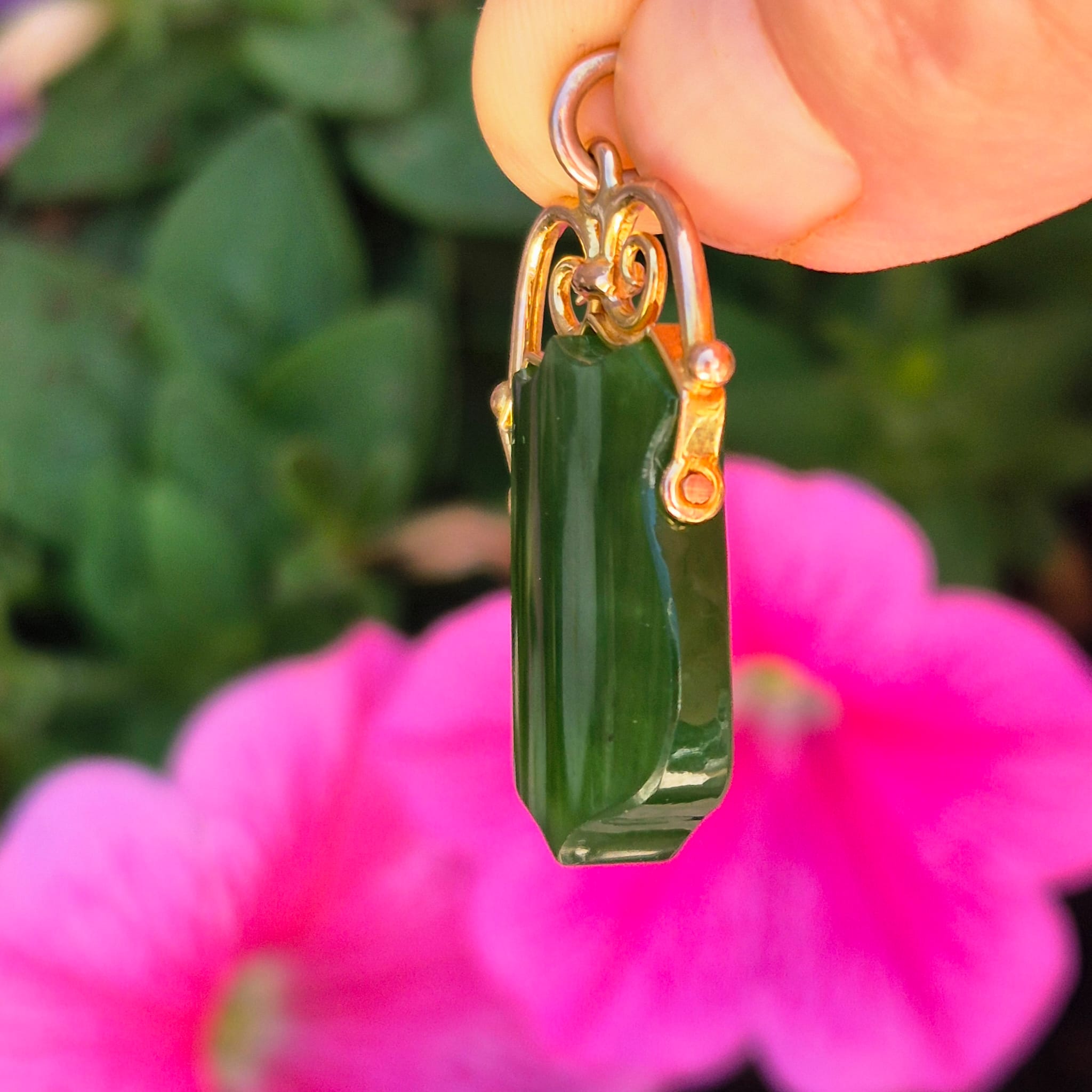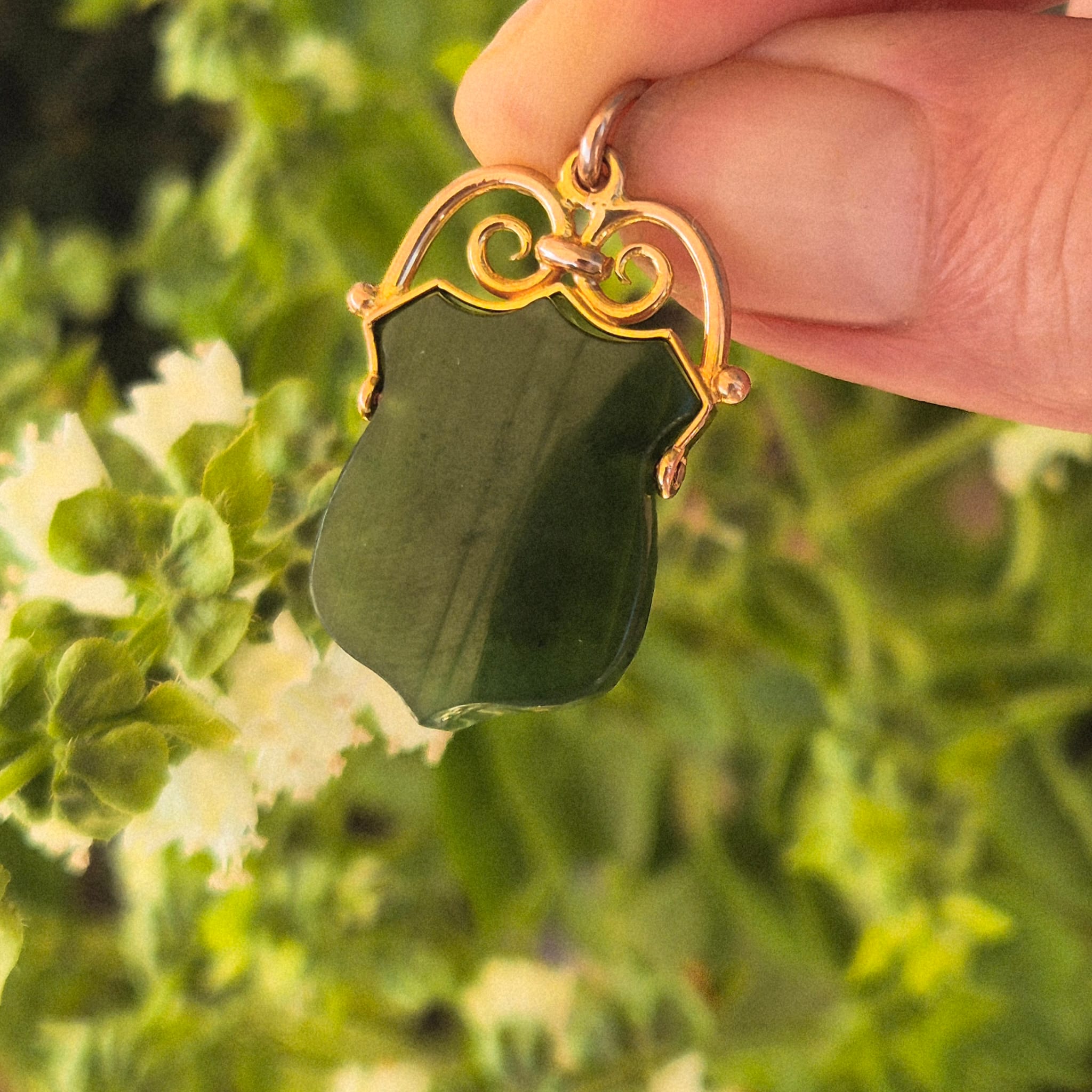 תליון פוב עתיק אנגלי מזהב 9 קאראט המשובץ אבן נפריט ג׳ייד (Nephrite Jade) בגוון ירוק עמוק.