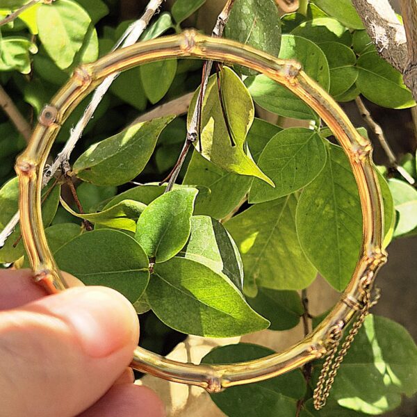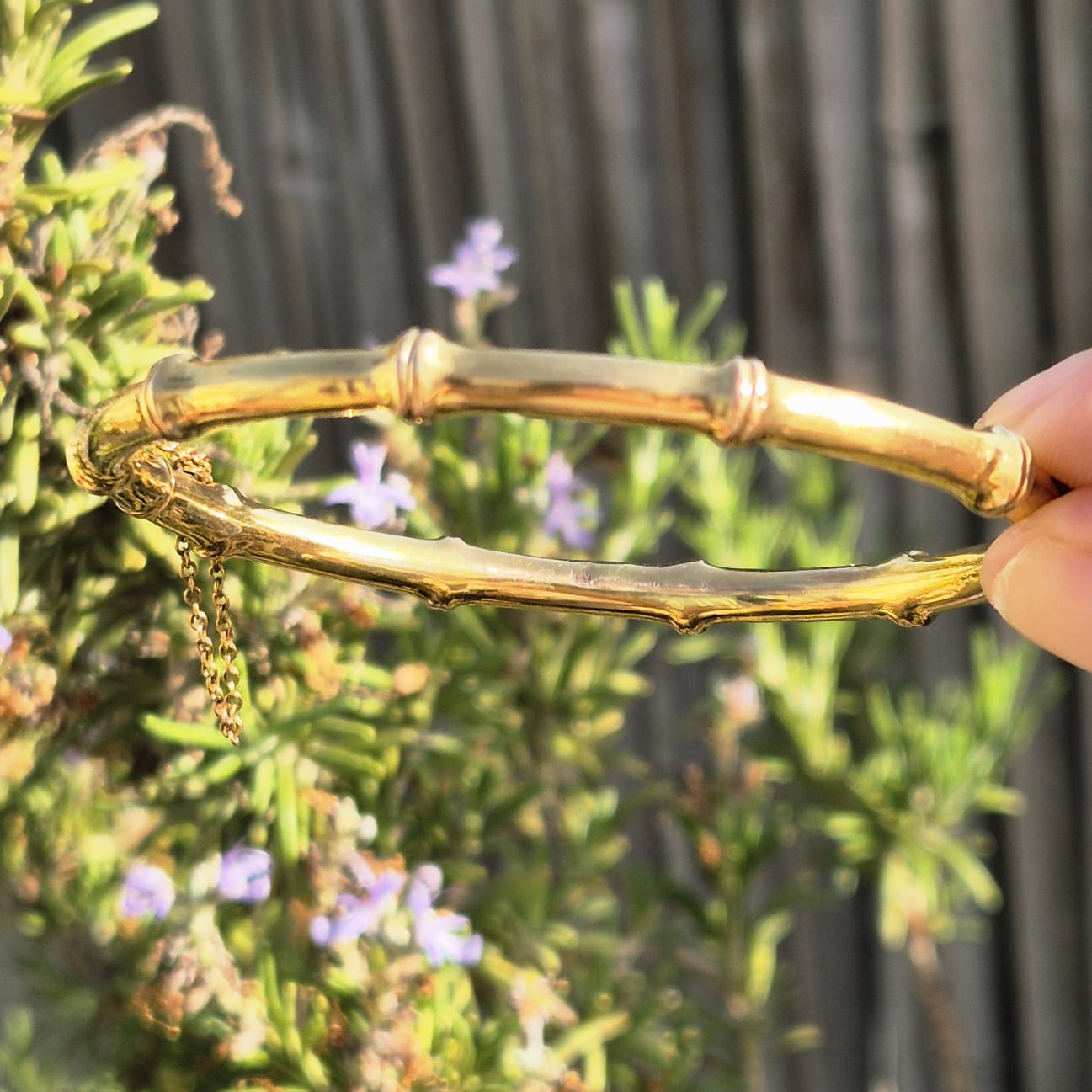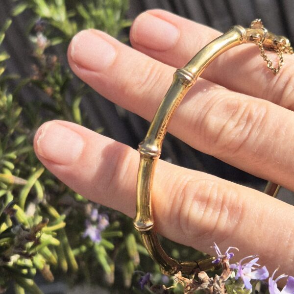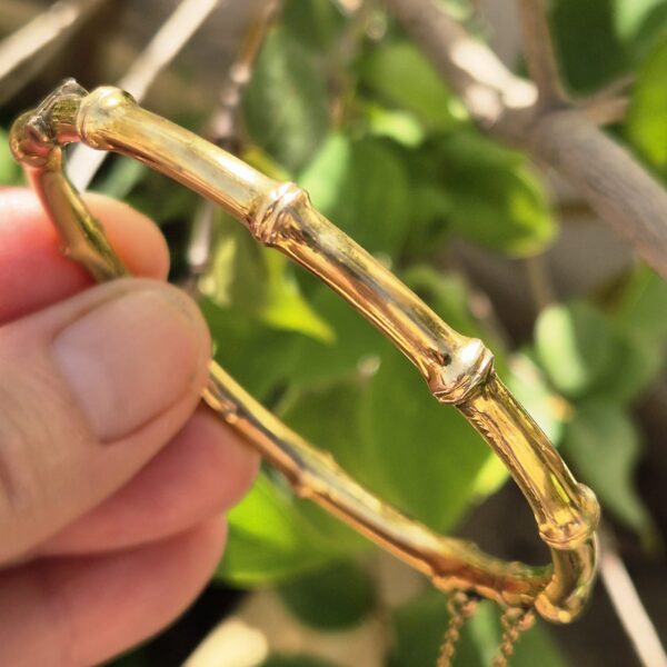 הצמיד בנוי כצינור זהב מעוגל עם חיבורים המדמים מפרקי קנה במבוק, בגימור מבריק ועדין.