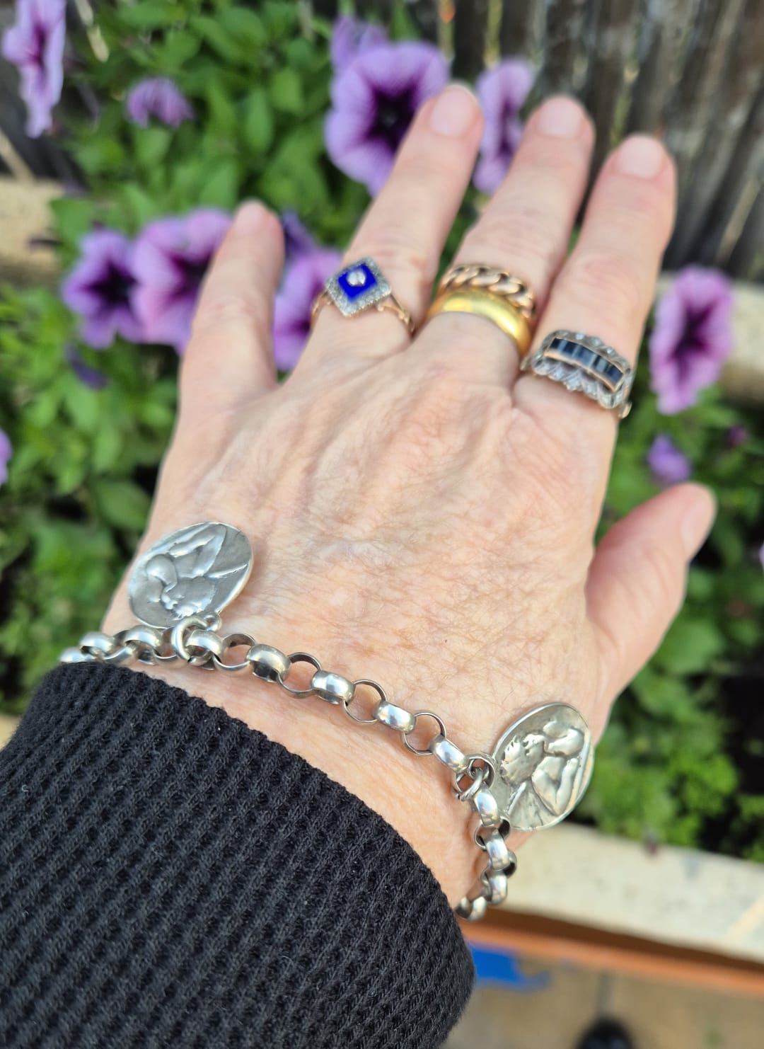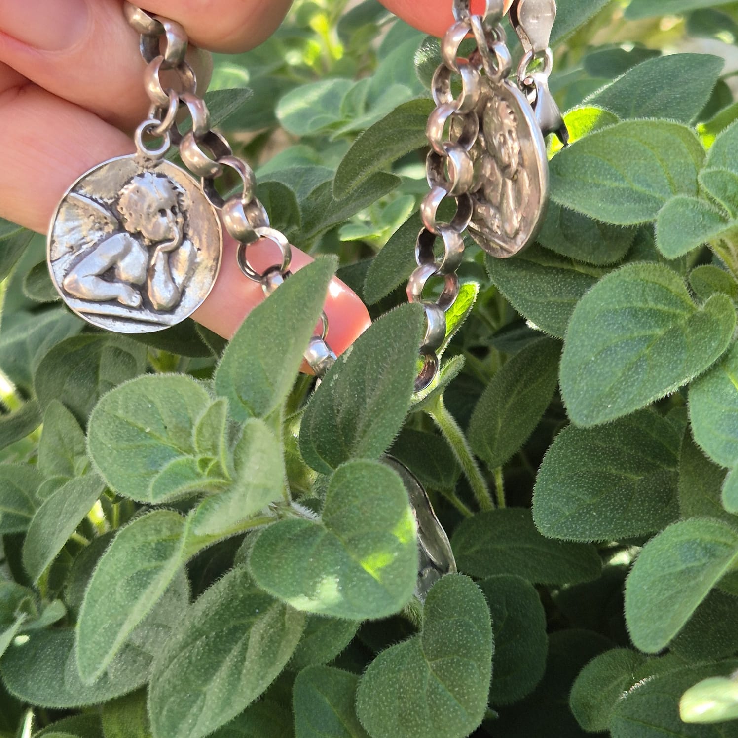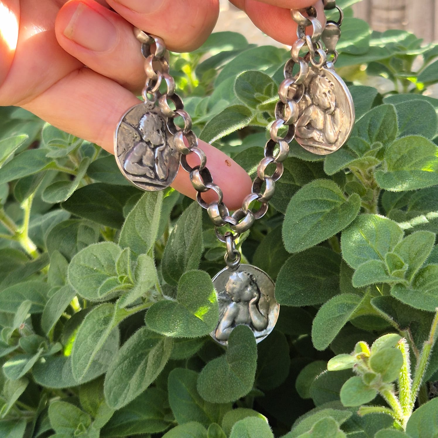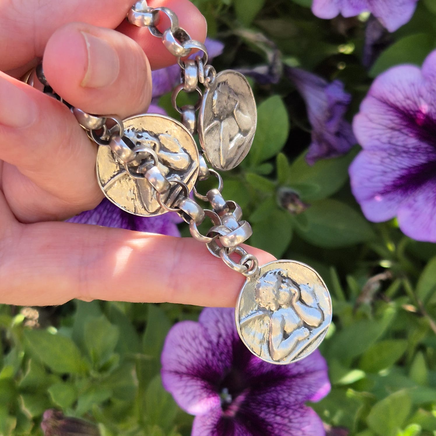 הצמיד מעוטר במדליונים עגולים עם דמויות מלאכים בתבליט.