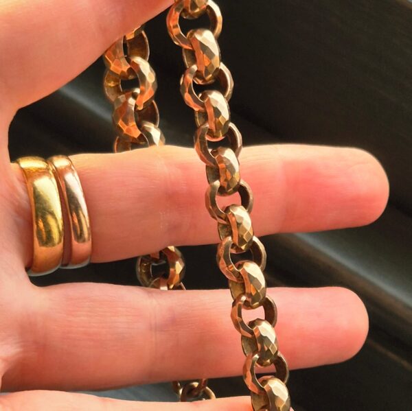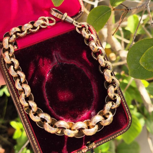 הצמיד עוצב באנגליה בסוף המאה ה־19, תקופה שבה חוליות זהב משולבות ובעלות פאות היו סמל של עושר ואלגנטיות מאופקת.