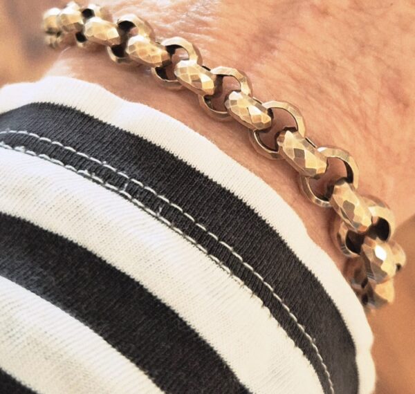 הצמיד בעיצוב חוליות רחבות מסוג curb links עם חיתוך פאות-פסטסט- (faceted links) היוצר ברק רך ואלגנטי תחת האור.