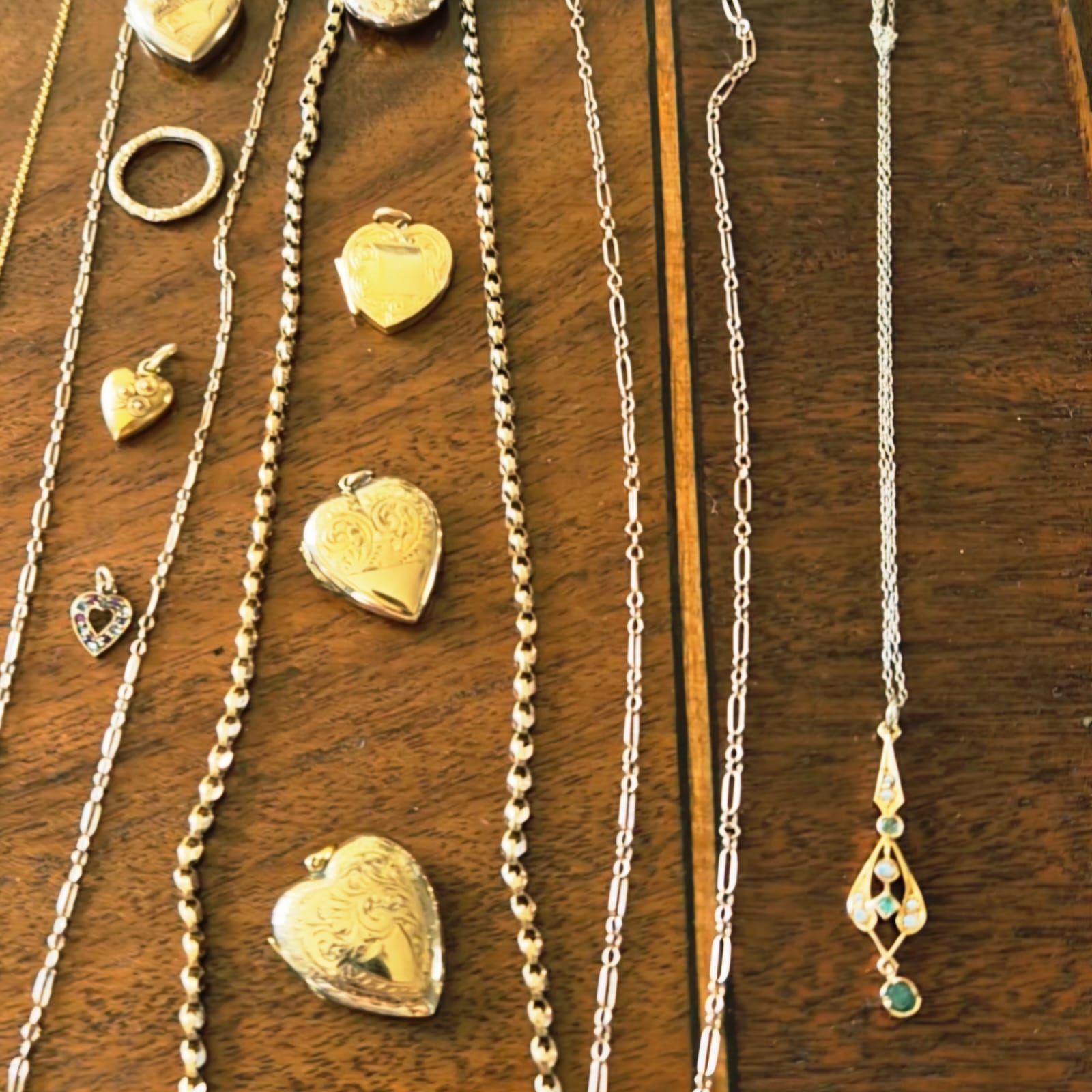 השרשרת המצורפת היא שרשרת זהב 9 קאראט עדינה בחוליות דקות, תואמת לתקופה ולאופי התליון.