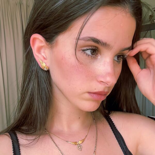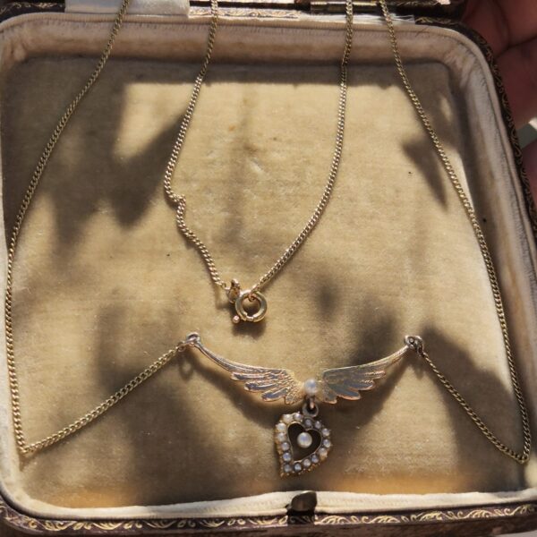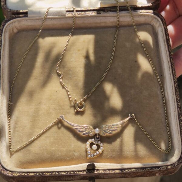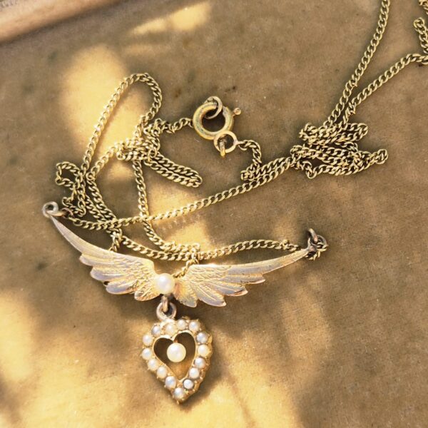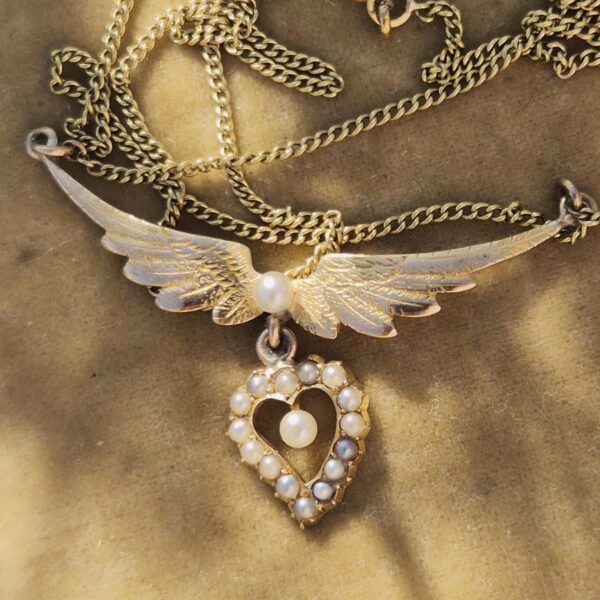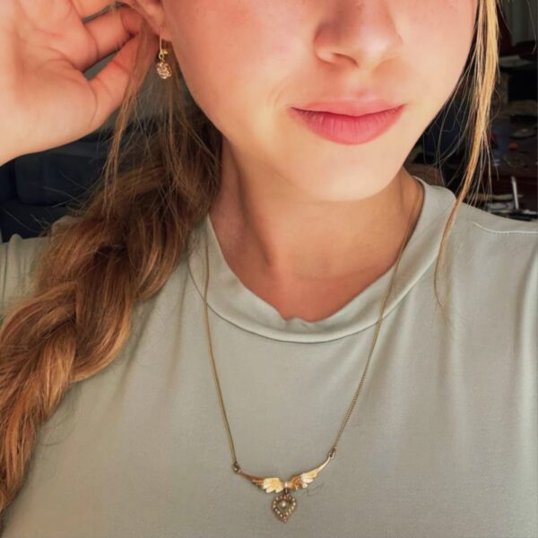 תליון עתיק זהב 15 קאראט מרהיב בעיצוב כנפי מלאך עדינות, מהן משתלשל תליון לב קטן מעוקל מסוג witch’s heart.