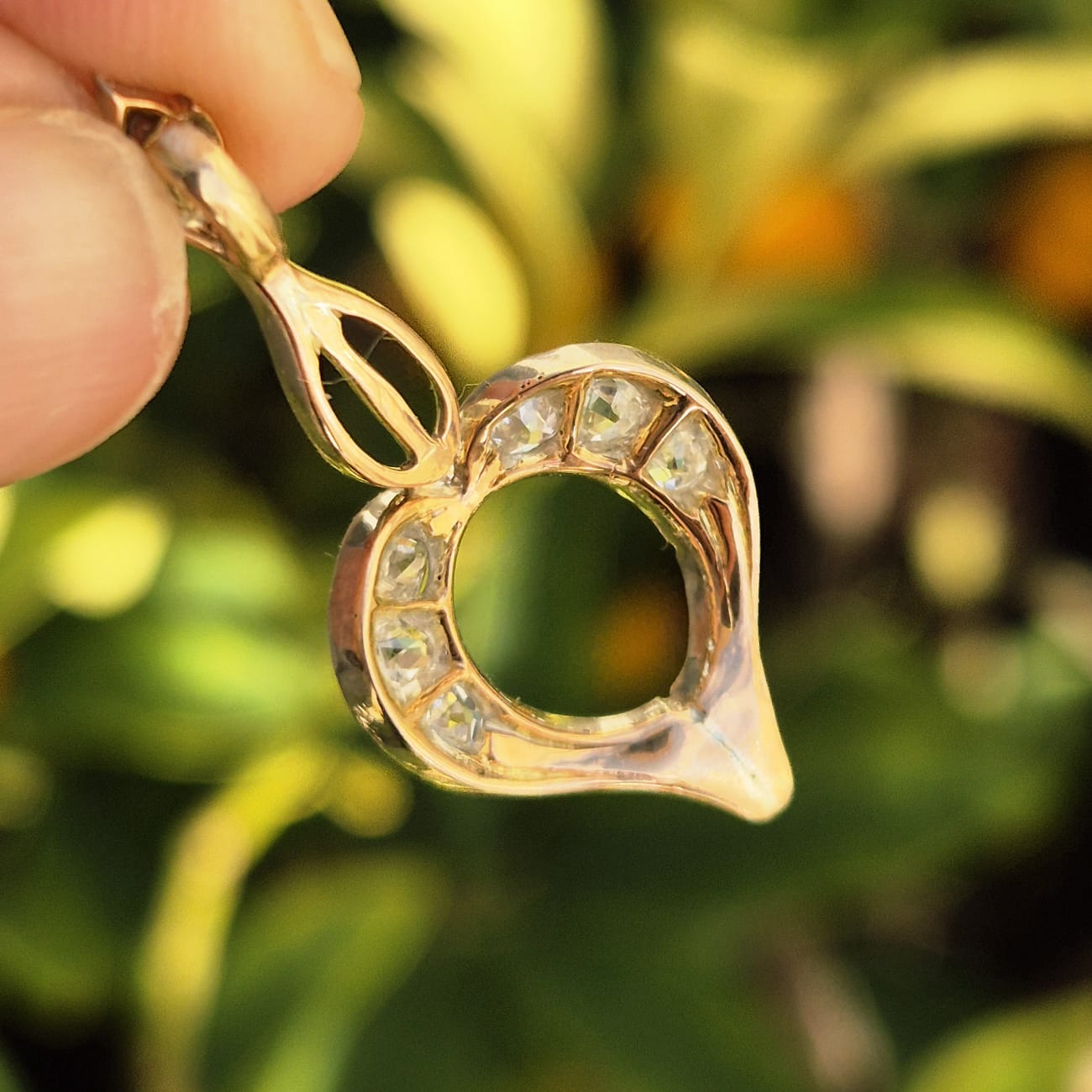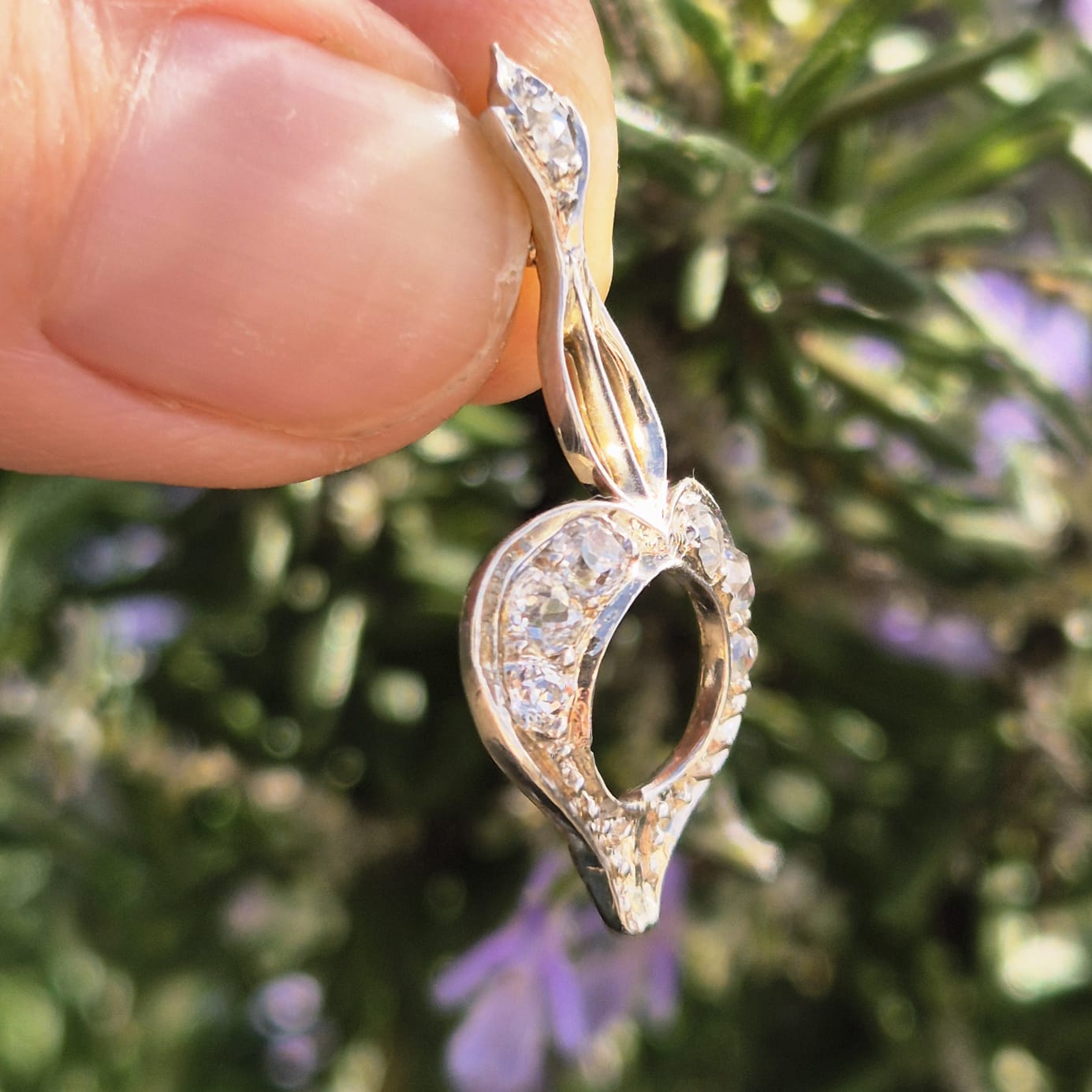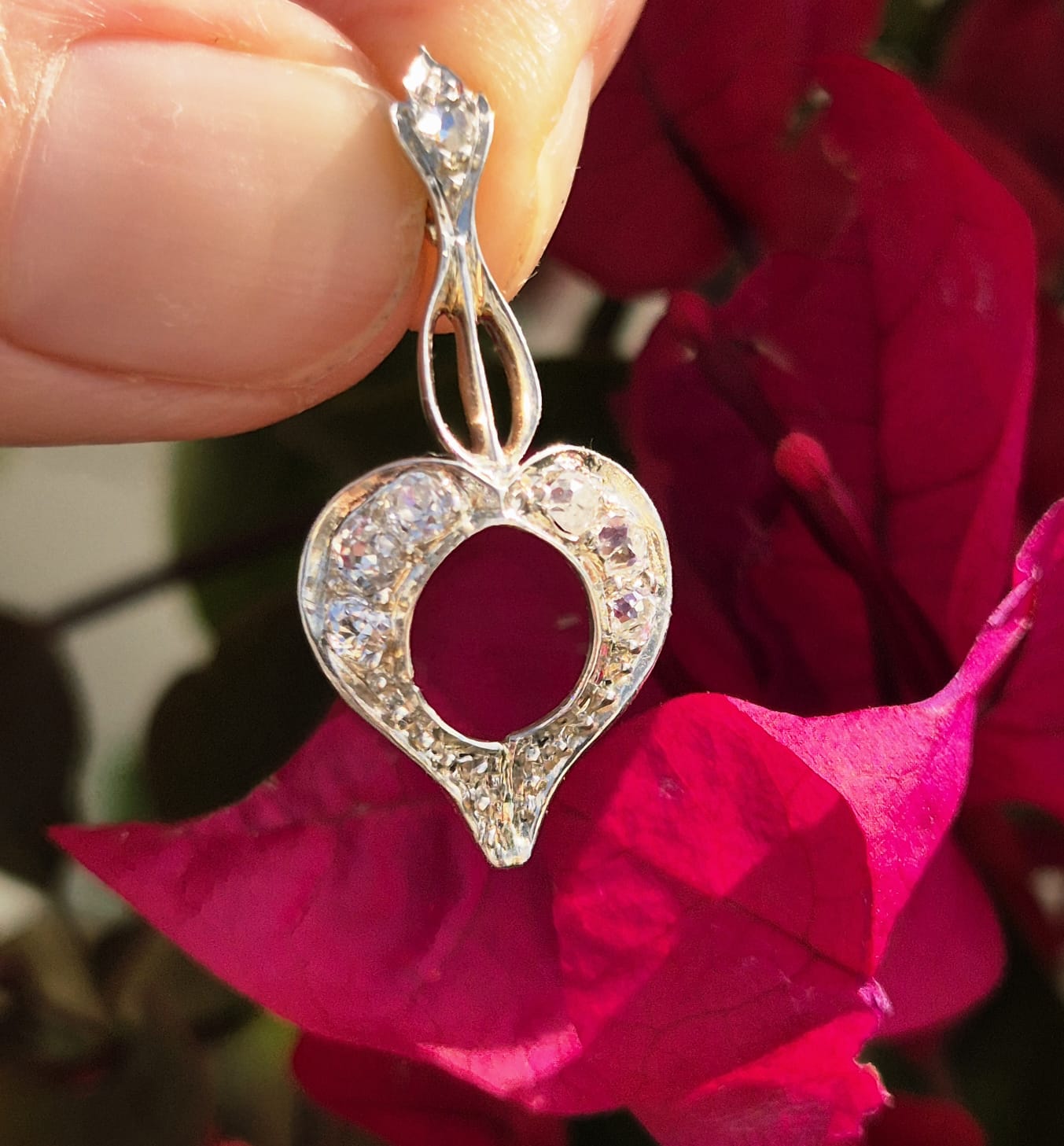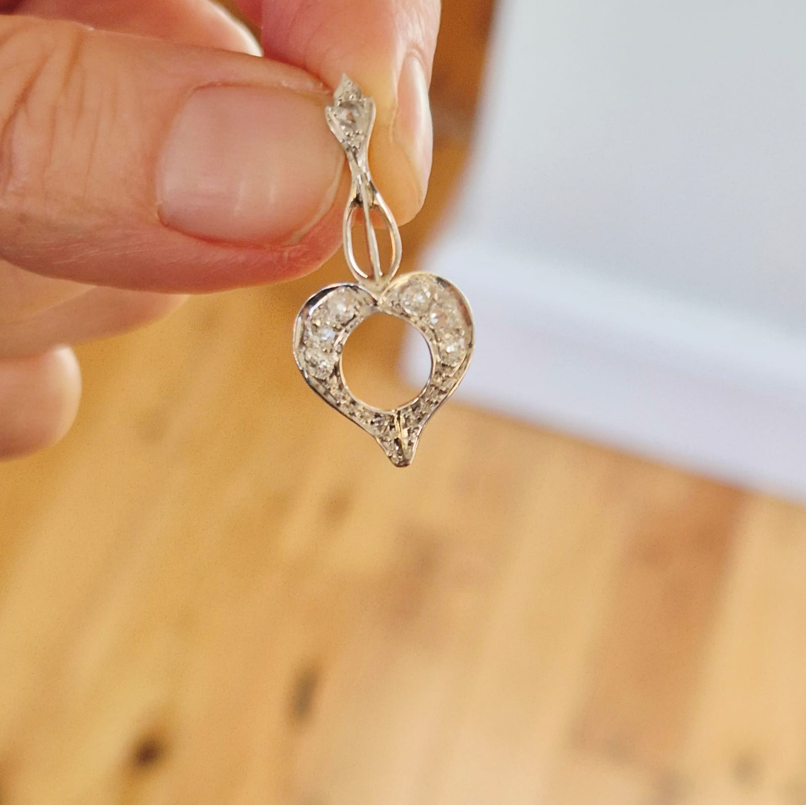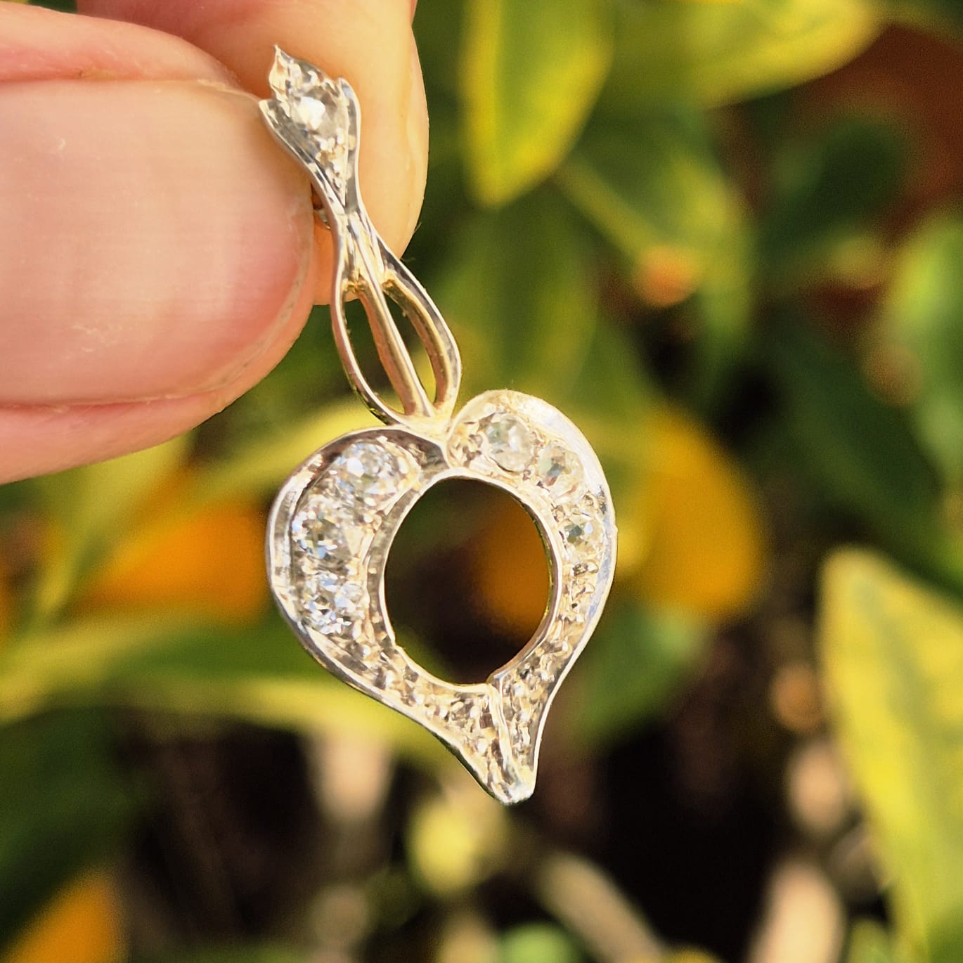 הלב בעל קווי מתאר רכים, ומשובץ ביהלומים בליטוש עתיק המעניקים ניצוץ קלאסי המאפיין תכשיטים מתקופת האר דקו.