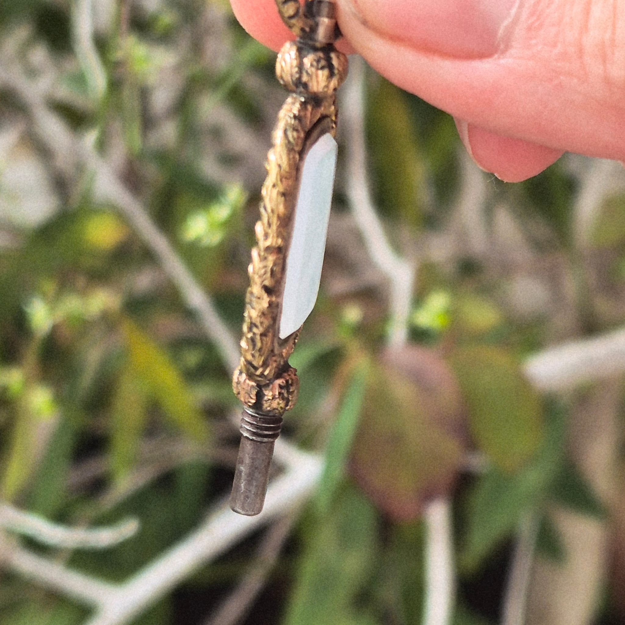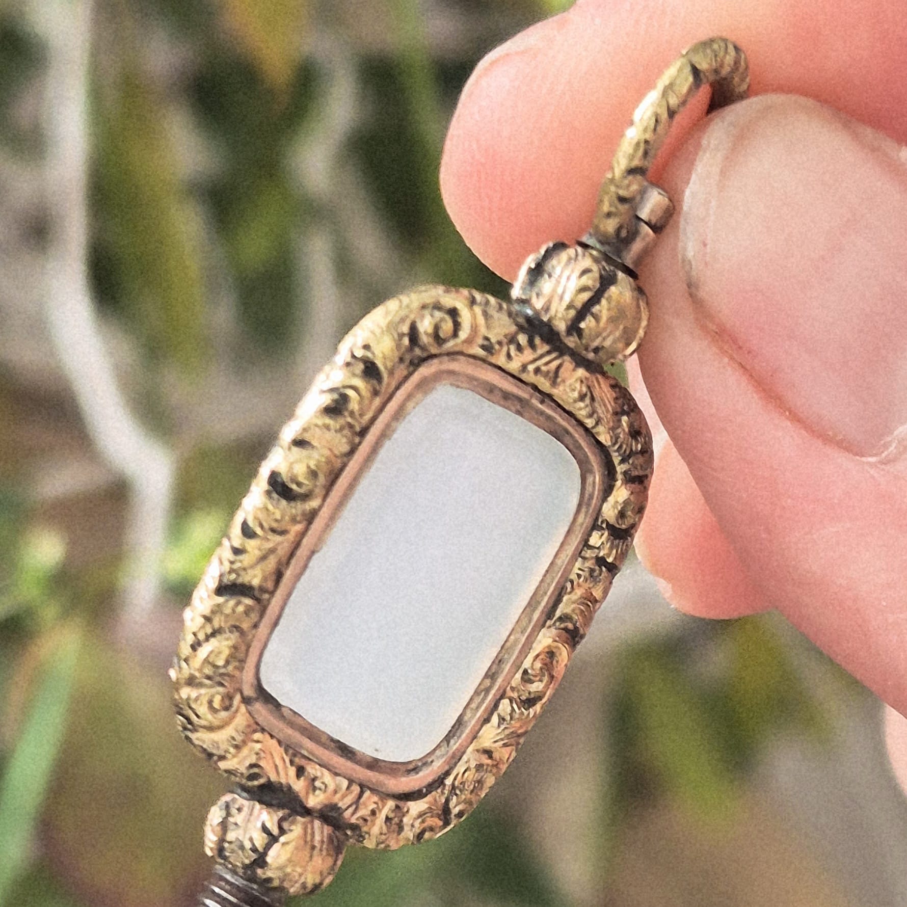 במרכז משובצת אבן קלסדוני מלוטשת בגוון חלבי עדין, אבן קוורץ טבעית בעלת ברק רך ואחיד שהייתה אהובה בתכשיטים ובאביזרי שעונים במאה ה־18 וראשית המאה ה־19.